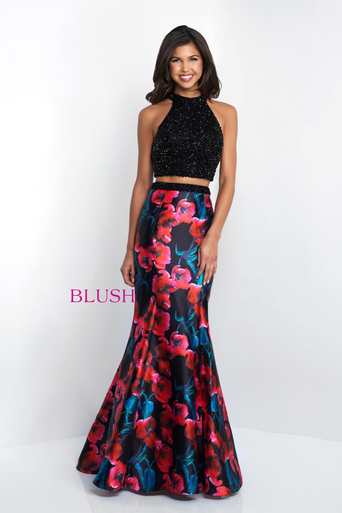 Two piece printed mikado mermaid skirt with hand beaded top